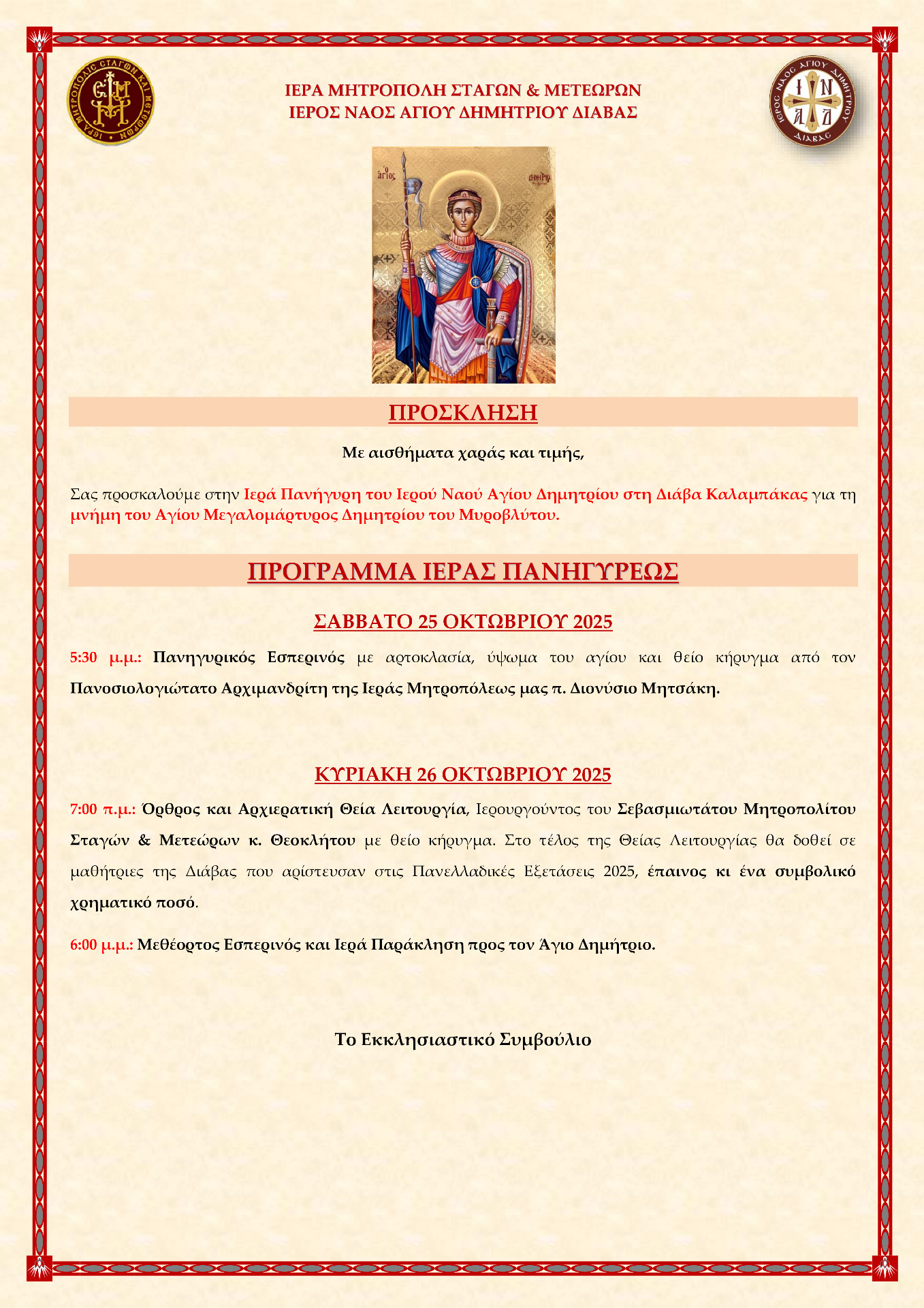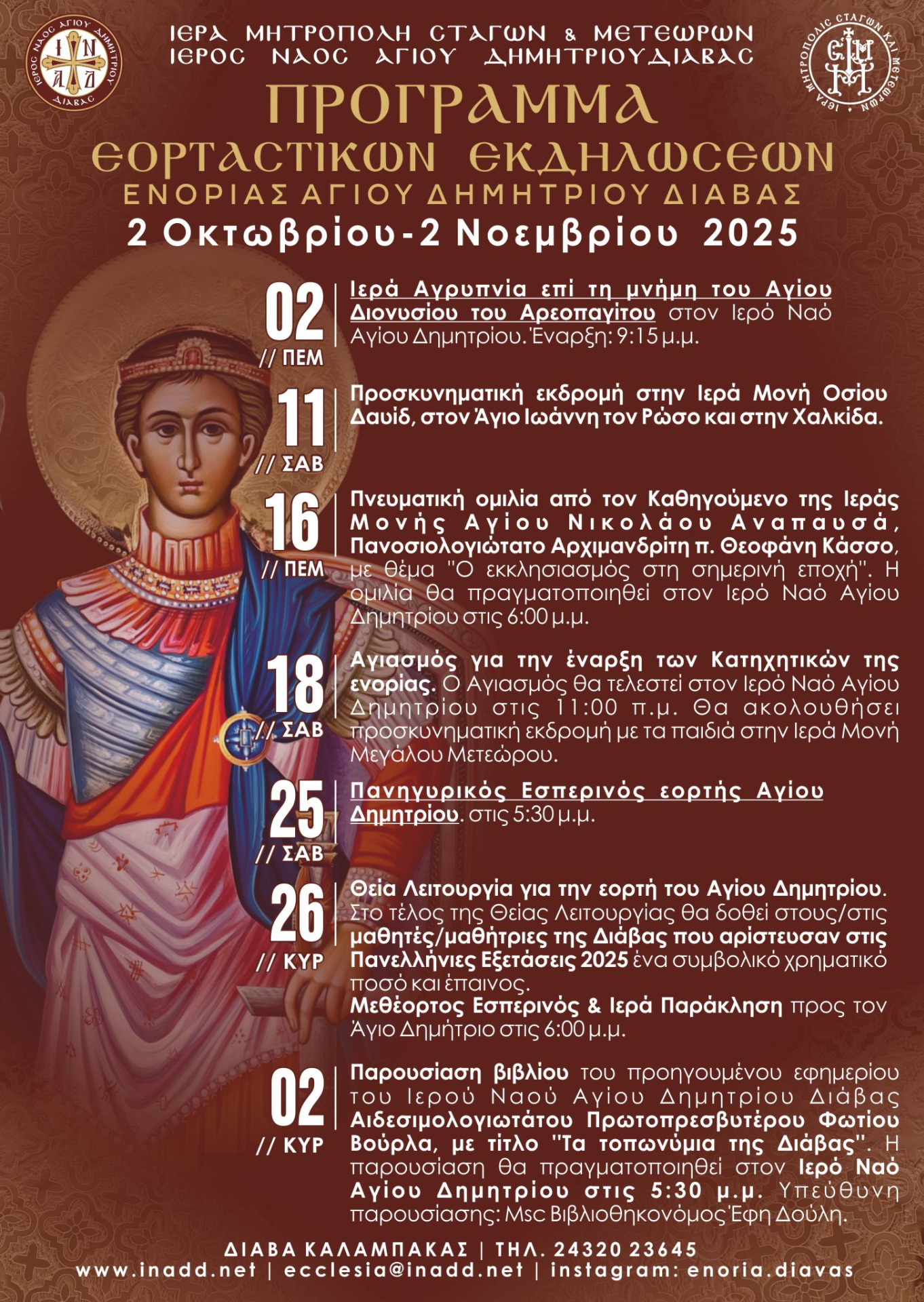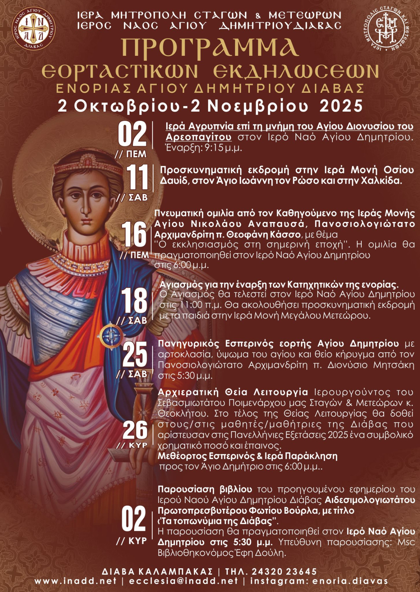 Η ενορία μας, στα πλαίσια των εορταστικών εκδηλώσεων του Ιερού Ναού Αγίου Δημητρίου Διάβας, με την ευλογία του Σεβασμιωτάτου Μητροπολίτη μας Σταγών και Μετεώρων κ. Θεοκλήτου, πραγματοποιεί μονοήμερη προσκυνηματική εκδρομή στην Εύβοια το Σάββατο 11 Οκτωβρίου με το ταξιδιωτικό πρακτορείο Tsiatsios Tours.