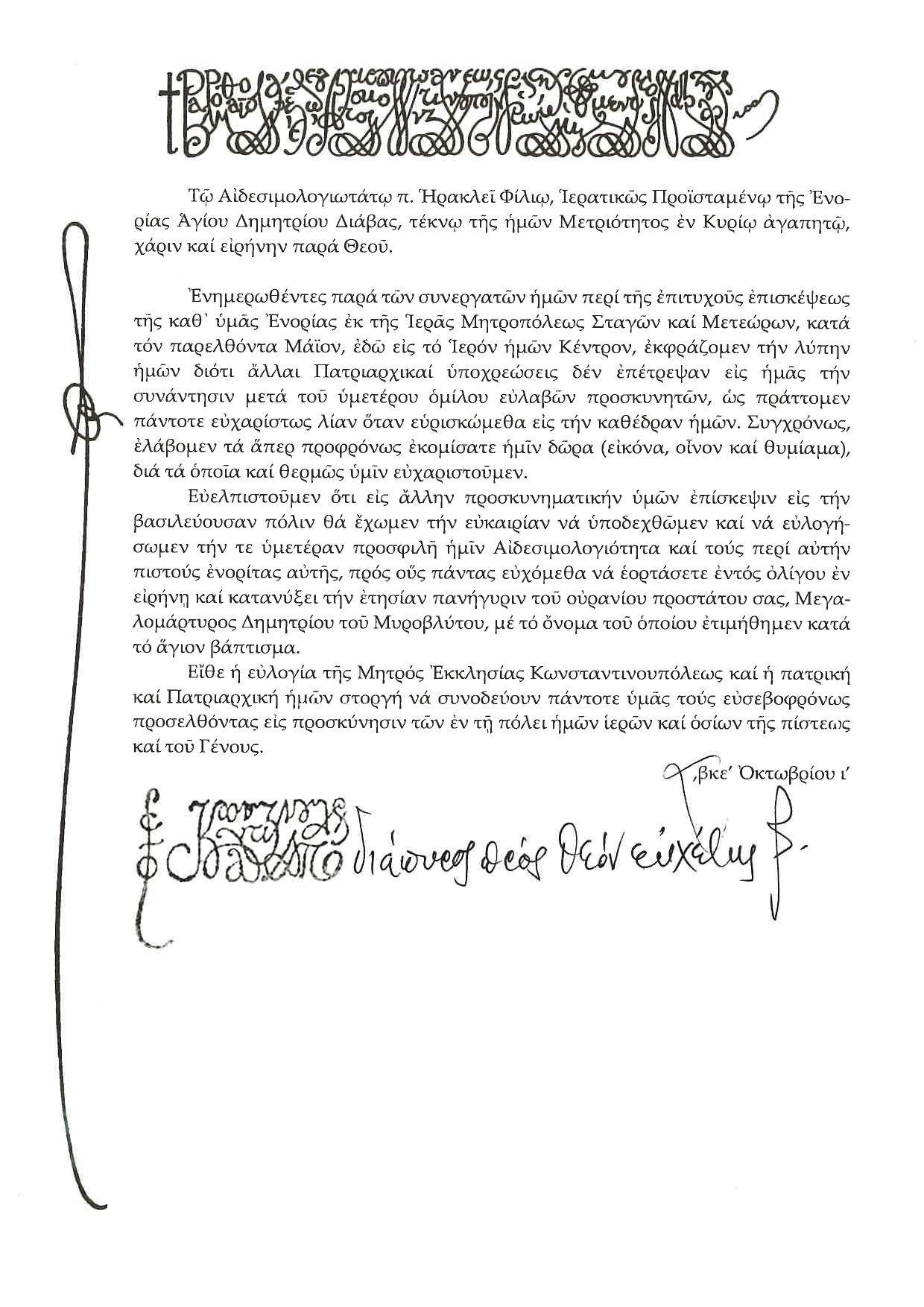 Παρόλα αυτά ο Οικουμενικός Πατριάρχης μας απέστειλε επιστολή, χαιρετίζοντας μας και ευελπιστώντας να μας ευλογήσει σε μία άλλη προσκυνηματική επίσκεψή μας στη βασιλεύουσα.
